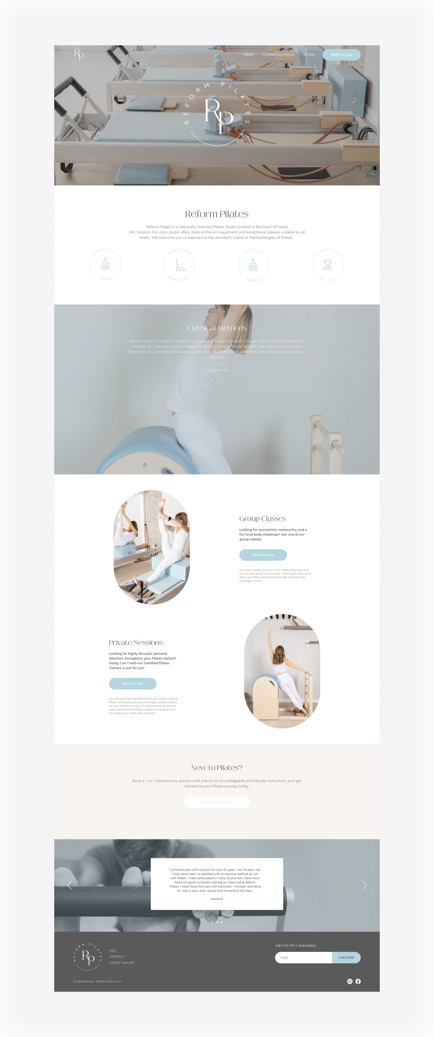 Reform Pilates'in istediği internet sitesi, kullanıcıların çevrimiçi pilates sınıflarına katılabilmesini ve gruplar için ödeme yapabilmesini sağlayacak bir platform. Yumuşak ve pastel tonlardaki genel tasarım, lüks bir atmosfer yaratmak için seçilen fontlarla birleşerek sakin ve aynı zamanda zarif bir hissiyat sunuyor. Kullanıcıların kolayca gezinebileceği, ödeme yapabileceği ve kaliteli bir deneyim yaşayabileceği bu site, hem estetik açıdan hem de kullanıcı dostu arayüzüyle dikkat çekiyor.